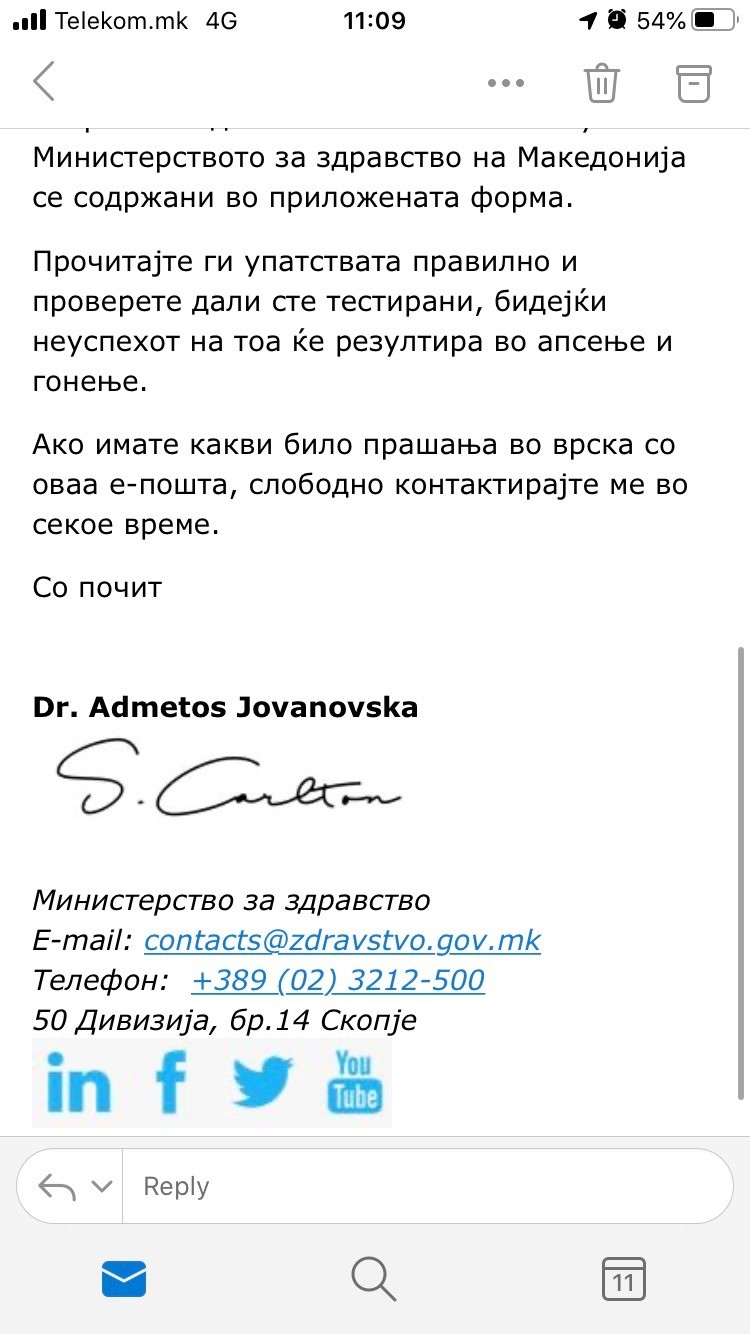 Еден од вашите контакти е Ковид-19 позитивни. Мејл со ваков наслов денеска добиле некои граѓани. На мејлот стои потпис од извесна Јовановска од Министерството за здравство. Иако веднаш наликува дека е лажен, сепак министерот за здравство Венко Филипче објави на твитер дека содржината од овој мејл е невистинита.