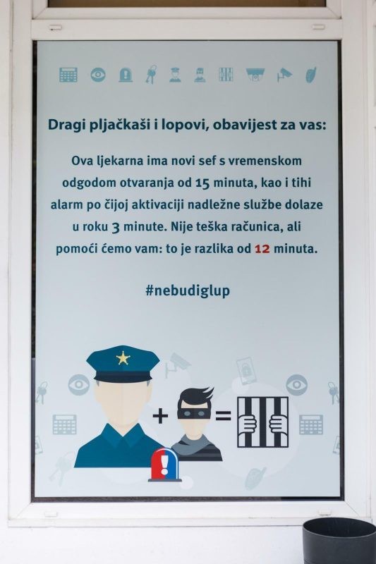 „Почитувани разбојници и крадци, информација за вас: Оваа аптека има нов сеф со 15-минутно доцнење на отворањето, како и тивок аларм, по чие активирање пристигнуваат надлежните служби во 3 минути. Тоа не е тешка пресметка, но ние ќе ви помогнеме, тоа е 12 минути разлика“, стои во порката.