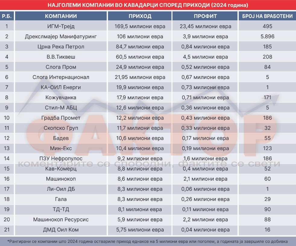 НАЈГОЛЕМИ КОМПАНИИ ВО КАВАДАРЦИ СПОРЕД ПРИХОД во 2024 година