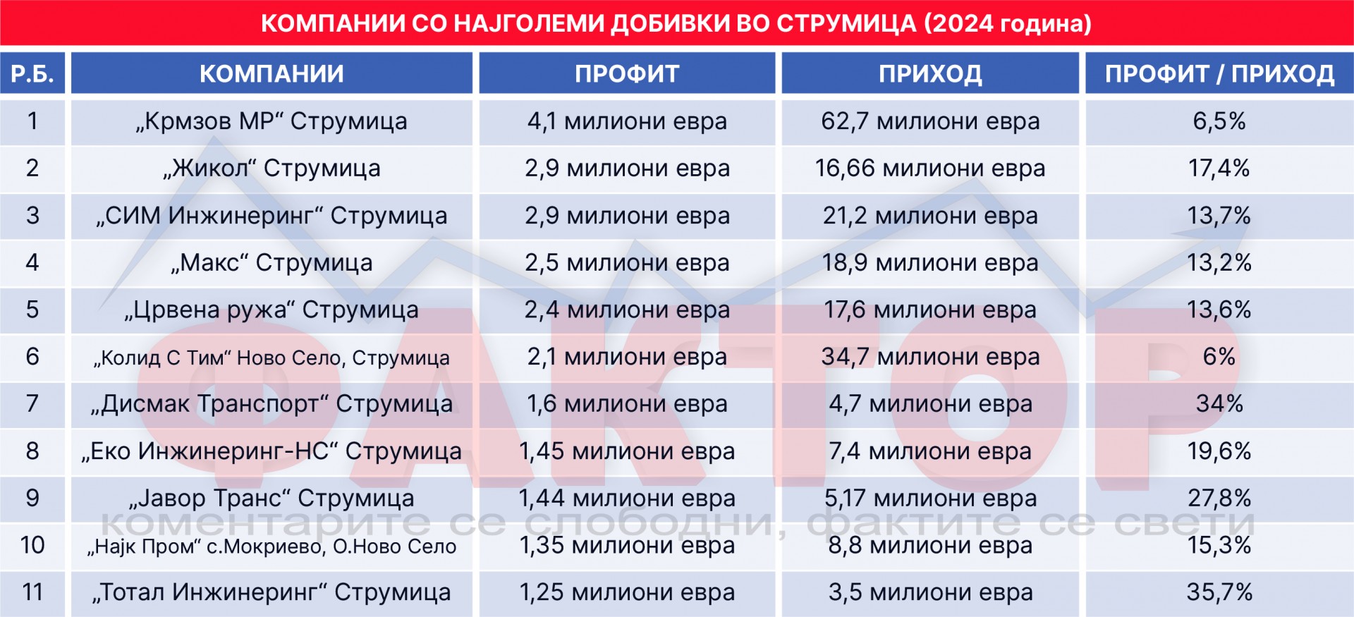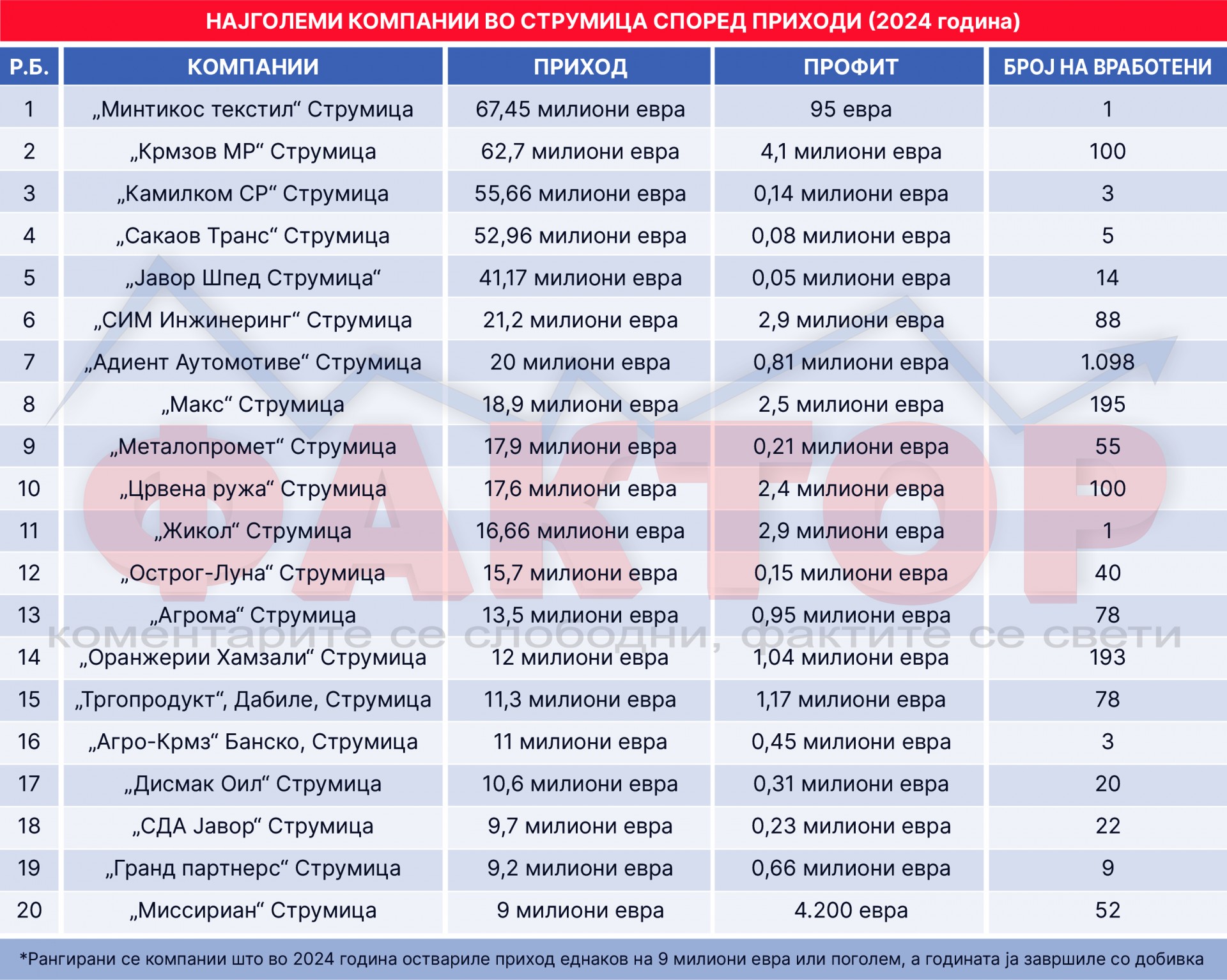 Фактор анализа СТРУМИЦА 2024: Бизнисот „врвa“ иако него го нема! Кои 17 фирми свртеле од 10 до 67 милиони евра?