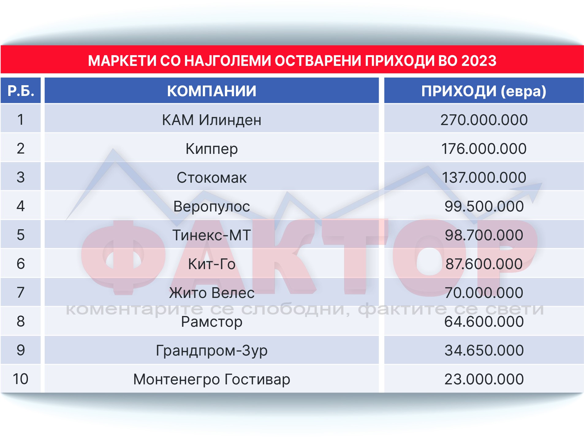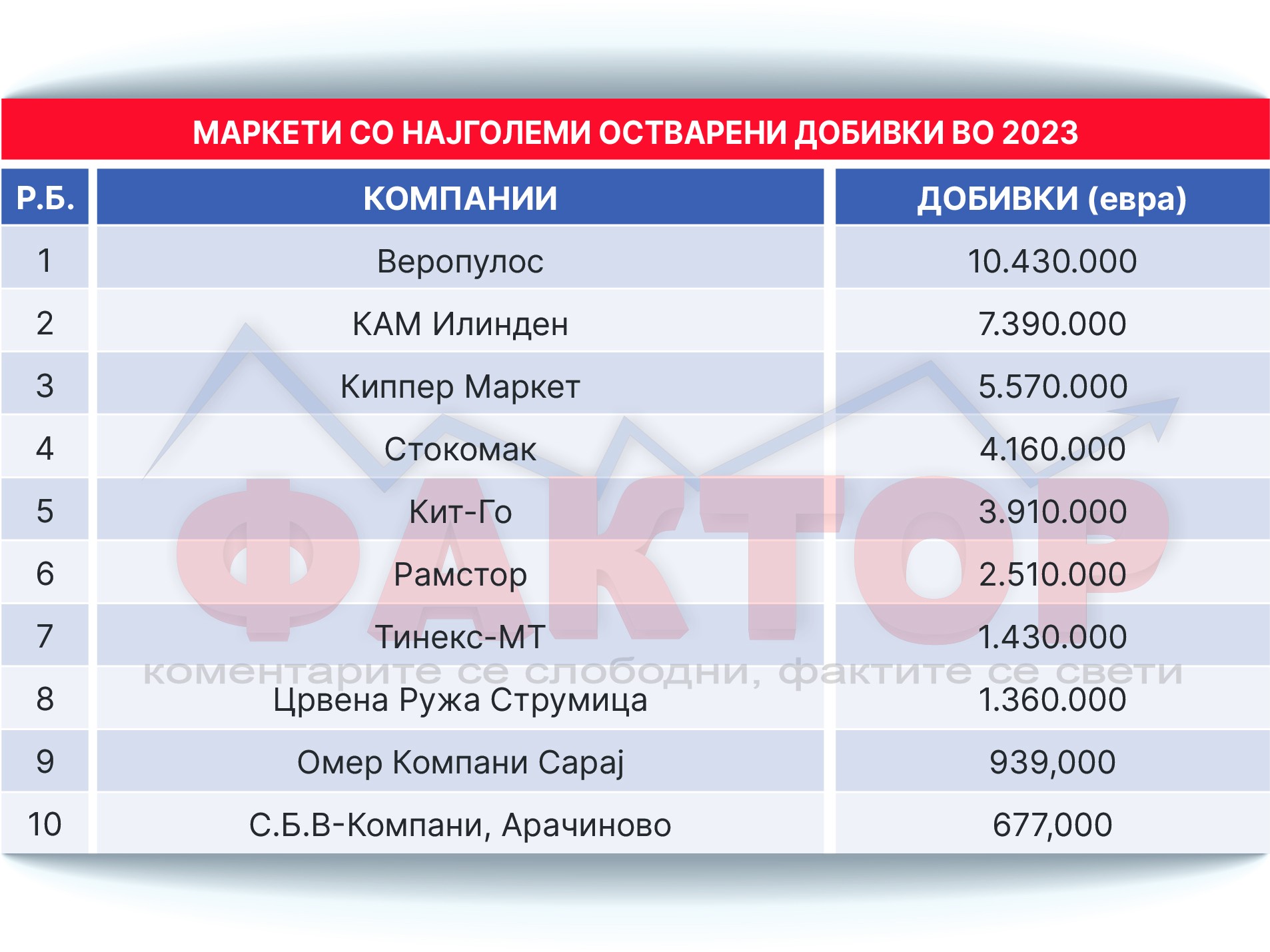 ФАКТОР АНАЛИЗА: Топ-10 најголеми маркети во 2023 - во КАМ се трошело најмногу, „Веро“ со најголема профитна маржа