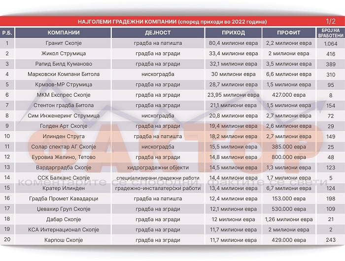 Македонија лани имала 100 приватни градежни компании и секоја од нив направила приход од најмалку 3 милиони евра, покажуваат официјалните податоци за 2022 година достапни во базата на Централниот депозитар. Анализата на достапните јавни податоци укажува на неколку факти за структурата и распределеноста на македонската градежна оператива и пропратните градежни дејности.