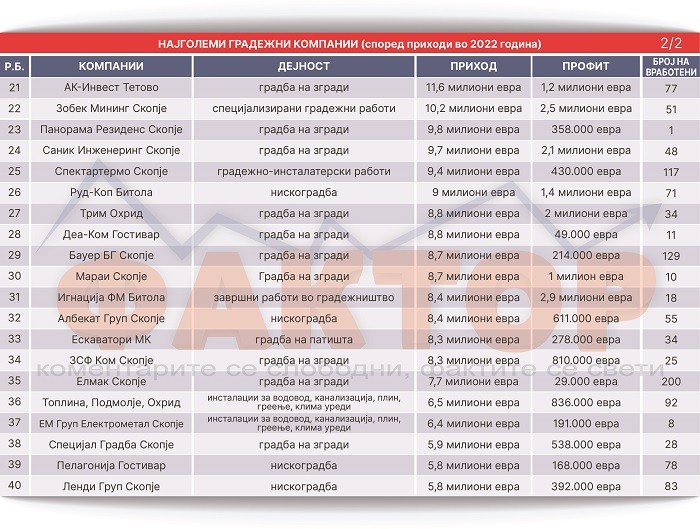 „Фактор анализа“: ТОП 40 – најголеми градежни компании!
