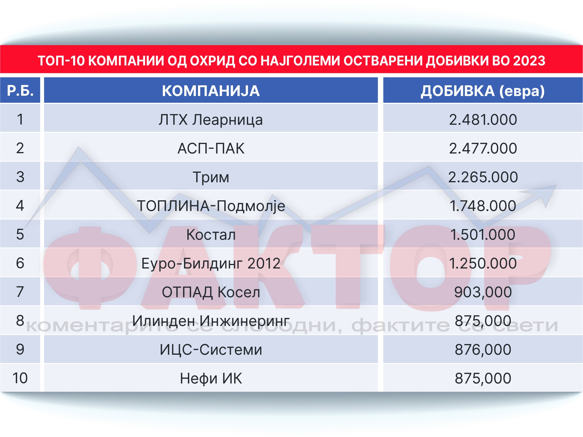 Леарницата за обоени метали ЛТХ Леарница, е компанијата од Охрид со најголема добивка за минатата година од овој град. Овој бизнис од Словенија соработува со останатите странски инвеститори во земјата кои работат за автомобилската индустрија.