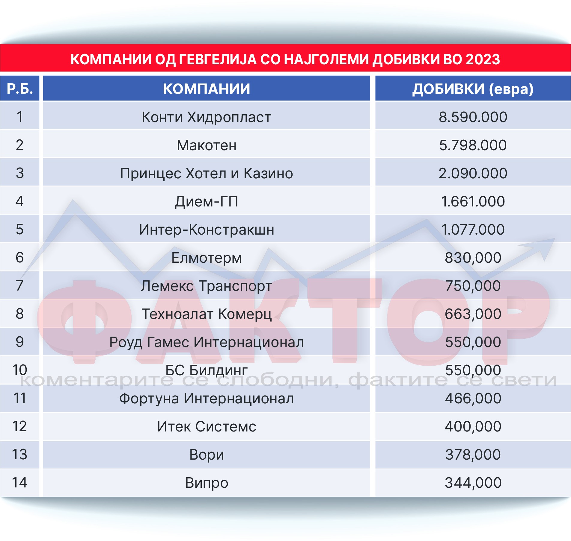 Во тоа предничат компаниите за приредување игри на среќа. Во првите единаесет со најголема остварена добивка во 2023 ги има дури три - Макотен, Принцес Хотел и Казино и Фортуна Интернационал. Сите три компании имаат лиценци за свои казина, сместени во хотели.