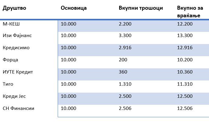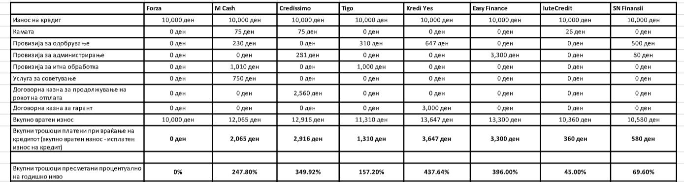 Позајмуваше едно лице, истата сума во сите осум финансиски друштва со ист пристап во барањето – дека парите се за неодложна обврска ама дека ќе се вратат на една рата. Поради тоа резултатите од истражувањето се споредливи, а во анализата произлезе разноликост меѓу друштвата во однос на каматата која ја наплатуваат во ваков случај и вкупните трошоци кои се пресметуваат на истата основица односно на позајмените 10.000 денари. Прв заклучок кој е презентиран и во табелата е дека за едномесечен кредит, ИУТЕ Кредит и Форца имаат најмала камата и вкупни останати трошоци. Во овие друштва каматата за еден месец е само неколку стотици денари – други трошоци нема. Кај сите останати позајмените 10.000 денари кои ги враќавме назад наеднаш, станаа за над 1.000 денари поголеми, во некои друштва вкупниот трошок е и над 3.000 денари.
