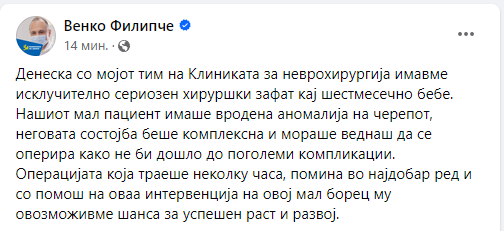 „Денеска со мојот тим на Клиниката за неврохирургија имавме исклучително сериозен хируршки зафат кај шестмесечно бебе. Нашиот мал пациент имаше вродена аномалија на черепот, неговата состојба беше комплексна и мораше веднаш да се оперира како не би дошло до поголеми компликации. Операцијата која траеше неколку часа, помина во најдобар ред и со помош на оваа интервенција на овој мал борец му овозможивме шанса за успешен раст и развој“, пишува Филипче.