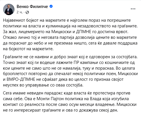 За лидерот на СДСМ, Венко Филипче најавениот бојкот на маркетите е најголем пораз на погрешните политики на власта.