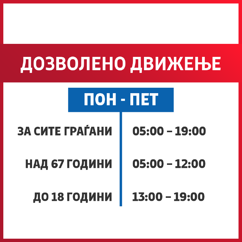 Секој работен ден, од понеделник до петок ќе биде дозволено движењето на граѓаните од 05:00 часот наутро до 19:00 часот. Забраната за движење во целата држава ќе почнува во 19 часот и ќе трае до 05 часот наутро.