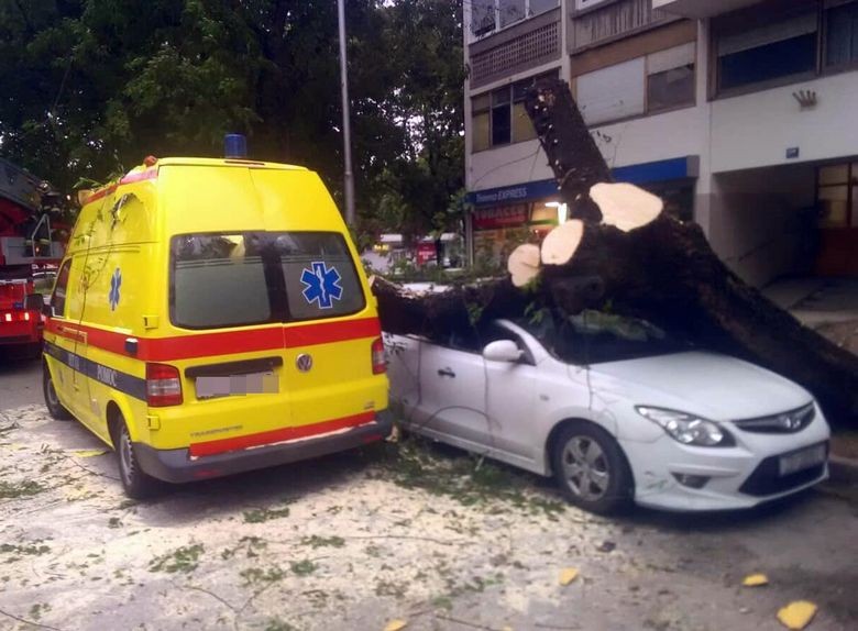 Ноќта пред два часот во Нов Загреб врз возило на брзата помош паднало дрво, амбулантното возило е уништено а медицинскиот техничар кој бил заробен во возилото го извлекле пожарникарите, пренесуваат хрватските медиуми.