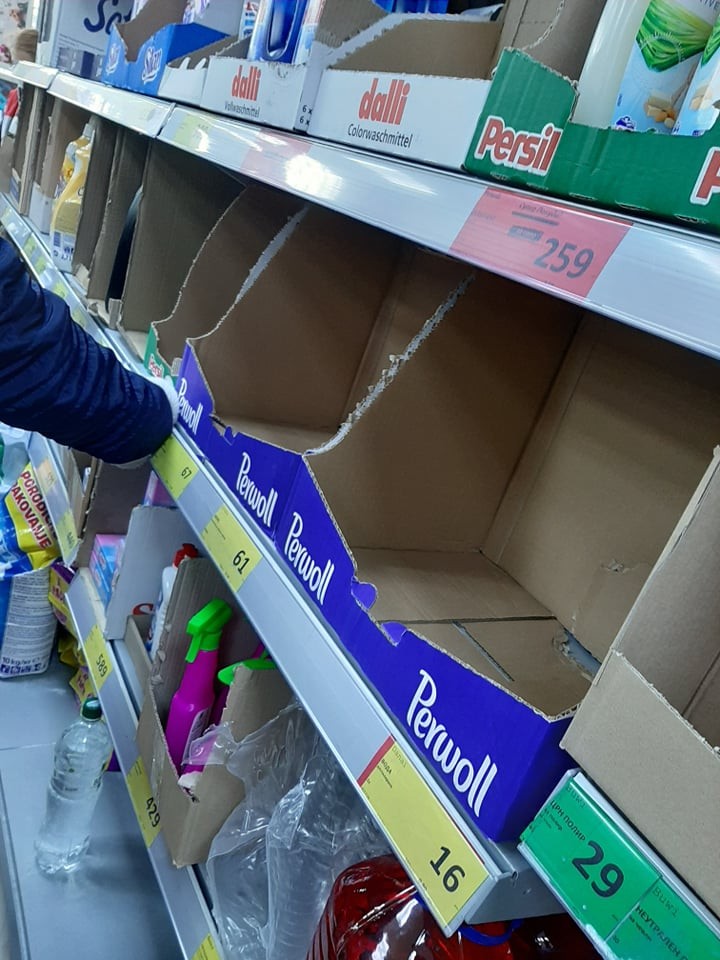 Од утрово скопјани почнаа позасилено да ги празнат маркетите. Граѓаните велат дека во повеќето се празни полиците каде стои зејтин, брашно, средства за хигиена, јајца.