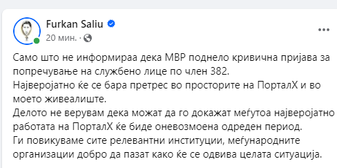 Новинарот Фуркан Салиу на социјалните мрежи oбјави дека полицијата против него поднела кривична пријава за попречување на службено лице по член 382. Како што пишува тој, најверојатно ќе бара претрес во просториите на ПорталХ и во неговото живеалиште.