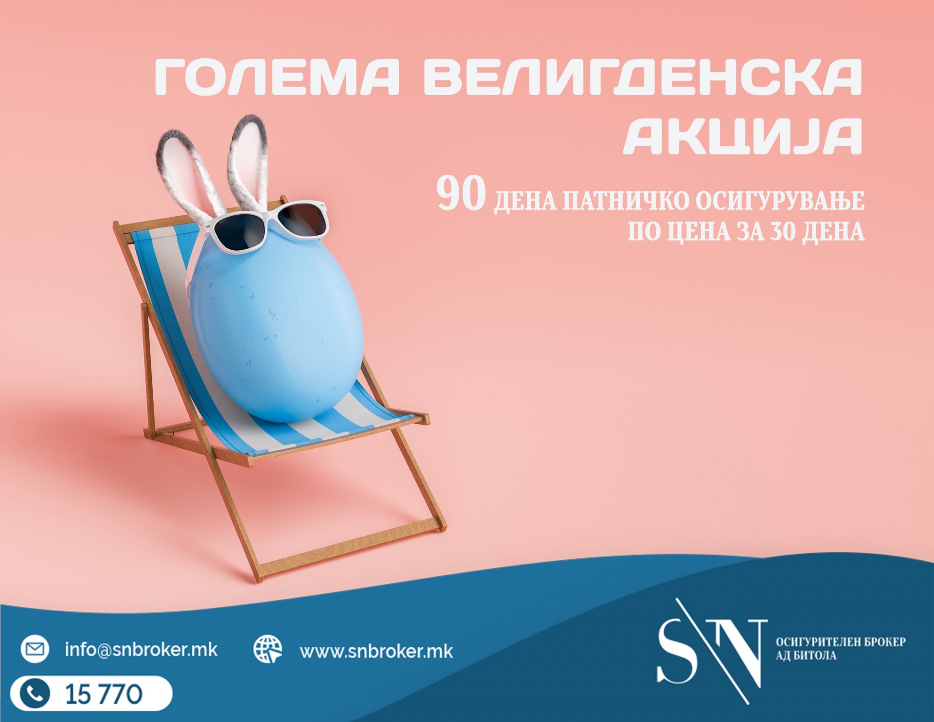 Во пресрет на Велигденските празници СН Осигурителен брокер АД Битола во рамките на голема промотивна велигденска акција ви овозможува да обезбедите патничко осигурување за 90 дена по цена за 30 дена.