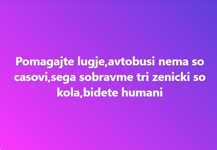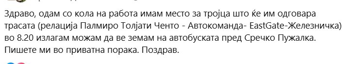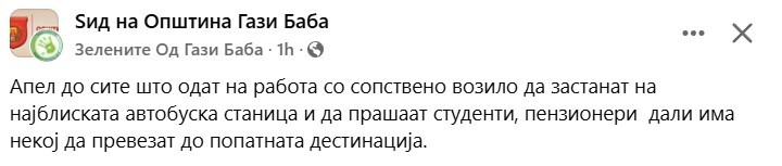 Апел до сите што одат на работа со сопствено возило да застанат на најблиската автобуска станица и да прашаат студенти, пензионери дали има некој да превезат до попатната дестинација, е само еден од апелите што скопјани ги споделуваат на социјалните мрежи како резултат на немањето градски автобуси.
