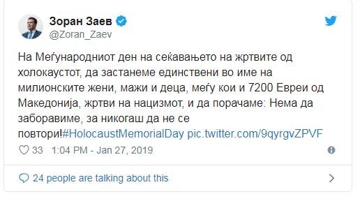 - Тој инсистира на употребата на името "Македонија", без да наведе "Северна",. Во своето објавување на твитер-порака за Светскиот ден на сеќавање на Холокаустот, г-дин Заев му оддаде почит на "7.200 Евреи од Македонија" кои станаа жртви на нацизмот. Вчера, во друг твит, тој рече дека "Македонија е дел од демократскиот свет"., објавија од телевиијата.