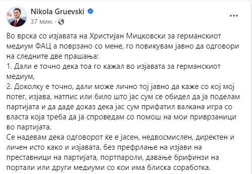„Во врска со изјавата на Христијан Мицковски за германскиот медиум ФАЦ а поврзано со мене, го повикувам јавно да одговори на следните две прашања: 1. Дали е точно дека тоа го кажал во изјавата за германскиот медиум, 2. Доколку е точно, дали може лично тој јавно да каже со кој мој потег, изјава, натпис или било што јас сум се обидел да ја поделам партијата и да даде доказ дека јас сум прифатил валкана игра со власта која треба да ја спроведам со помош на мои приврзаници во партијата. Се надевам дека одговорот ќе е јасен, недвосмислен, директен и личен исто како и изјавата, без префрлање на изјави на преставници на партијата, портпароли, давање брифинзи на портали или други медиуми со кои има блиска соработка“, пишува Груевски на Фејсбук.