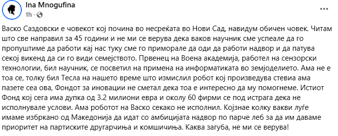 Инфлуенсерката Ина Многуфина ја искоментира кариерката на Васко Саздовски, човекот кој вчера загина во Нови Сад откако се урна натстрешница од Железничка станица.