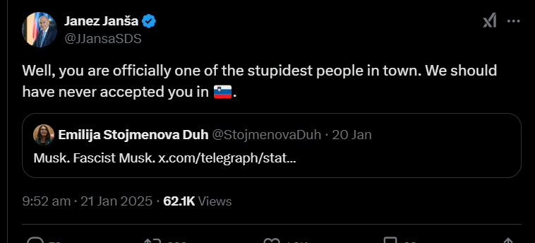 Поранешната министерка за дигитална трансформација на Словенија, Емилија Стојменова Дух, преку социјалната мрежа „Х“ прими тешки навредливи зборови од поранешниот трикратен словенечки премиер Јанез Јанша.