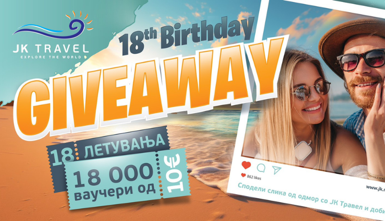 Со голема возбуда и гордост ЈК Травел го најавува својот 18-ти роденден и во чест на истиот организира голем Giveaway за сите лојални клиенти.