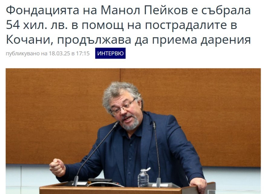 Бугарскиот пратеник Манол Пејков од 16 март до 19 март преку хуманитарна кампања на својата фондација „Манол Пејков и пријатели“ собра околу 54.000 лева, односно околу 27.000 евра, а вчера пристигна во Кочани да ги предаде парите.