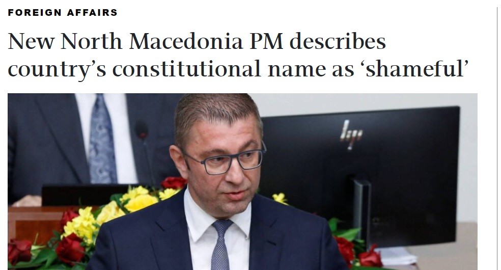 Новиот премиер на Северна Македонија , Христијан Мицкоски, го опиша вклучувањето на ознаката „Северна“ во уставното име на земјата како „срамно“, но рече дека мора да „капитулира“ пред неговата употреба бидејќи таа веќе е дел од правниот систем, пишува Катимерини.