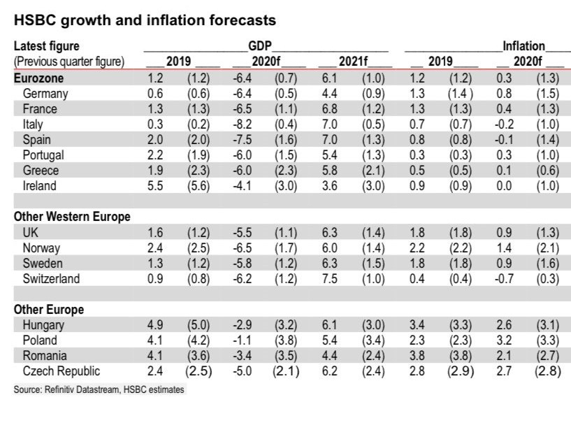 Огромен пад на европските економии предвидува британската ХСБЦ банка. Според банката, економијата на државите членки на еврозоната оваа година во просек ќе доживее пад од 6,4 отсто.