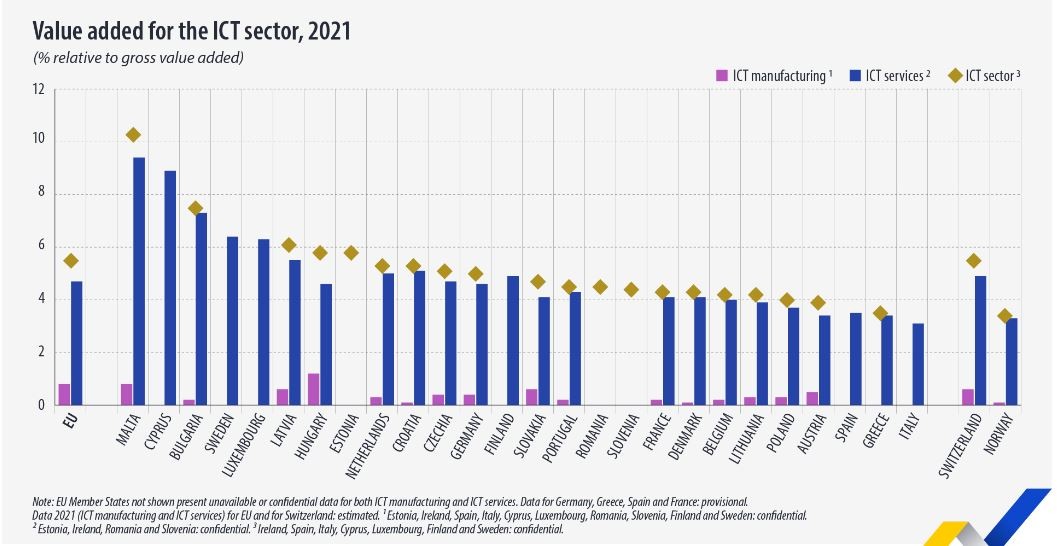 - Во 2021 година, додадената вредност на секторот за информатичка и комуникациска технологија (ИКТ) на ЕУ беше еднаква на 5,5 проценти од бруто додадената вредност на Европската унија. Од нив, 4,7 отсто отпаѓаат на ИКТ услугите и 0,8 проценти од ИКТ производството. Од земјите на ЕУ за кои беа достапни податоци за збирниот „ИКТ сектор“, земја со најголема бруто додадена вредност за сите области од ИКТ индустријата беше Малта која има раст од 10,3 отсто, додека Грција имаше најниска стапка од само 3,5 проценти – се појаснува во анализата на „Евростат“.