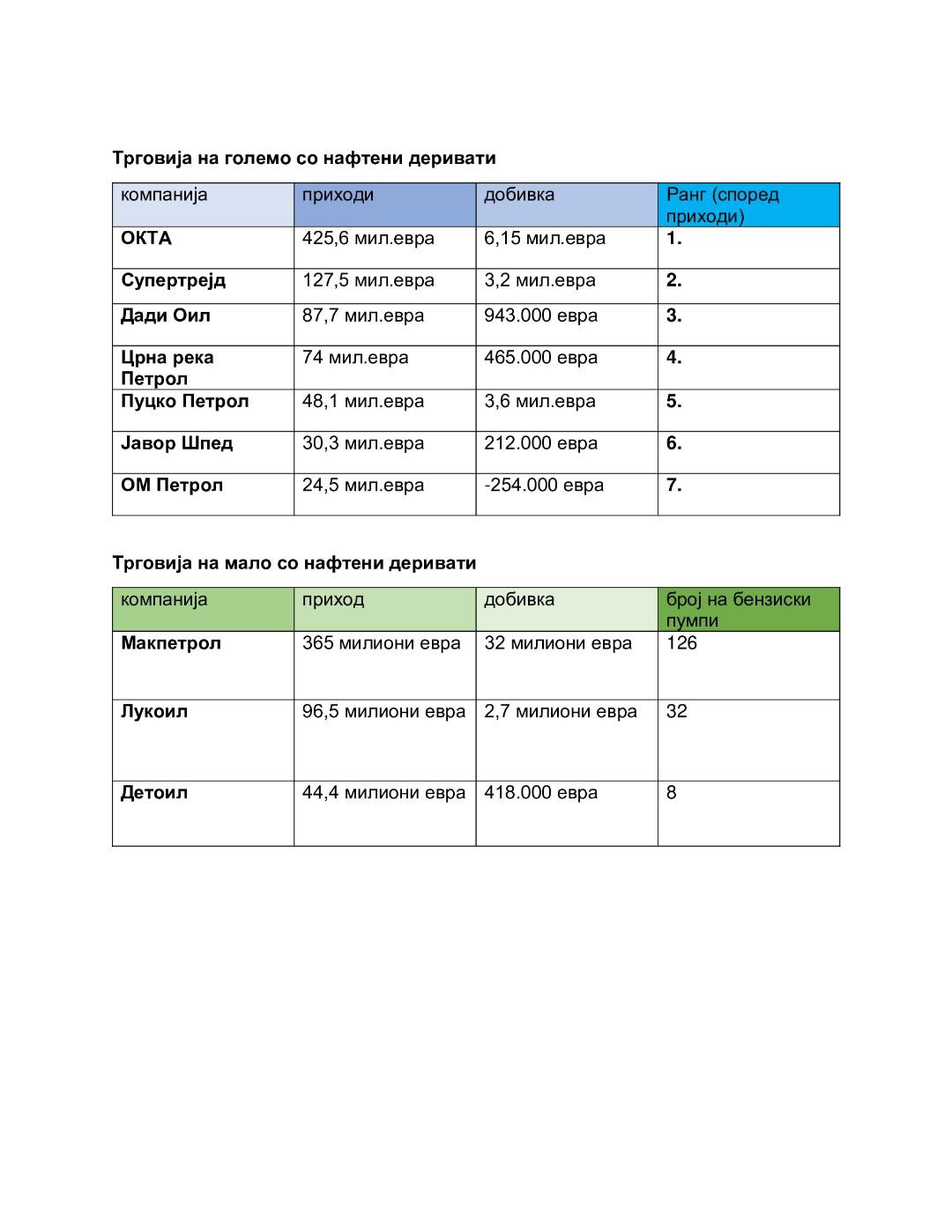 Животот се тркала и тоа е реалноста. Македонскиот пазар на нафтени деривати лани конзумирал дизел, бензин, метан, керозин, мазут и ТНГ вредни повеќе од половина милијарда евра. Тоа е бизнис на големи играчи без разлика дали тргуваат на големо или на мало на нивните бензински пумпи. Резултатите од лани покажуваат дека индустријата закрепна од корона кризата. ОКТА останува неприкосновена во трговијата на големо, каде во меѓусебната конкуренција особено се истакнаа „Супертрејд“, „Црна река Петрол“ и „Дади Оил“. Најпрофитабилна компанија е „Пуцко Петрол“ од аспект на добивка во приход од продажба. „Макпетрол“ и понатаму е гигант и доминантен учесник во трговијата на мало со горива. Со своите 126 бензински пумпи оствари приход од 330 милиони евра и држи над 50 отсто од целата малопродажба на нафтени деривати. Неговиот конкурент „Лукоил Македонија“ има 32 пумпи на кои лани направил приход од речиси 100 милиони евра. Третиот играч на пазарот на продажба на мало е „Детоил“ со 44 милиони евра, а има осум бензински пумпи