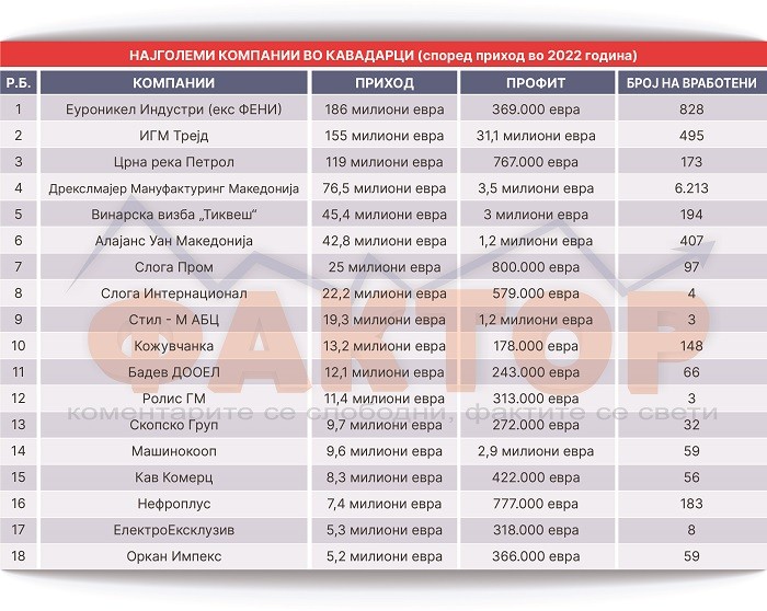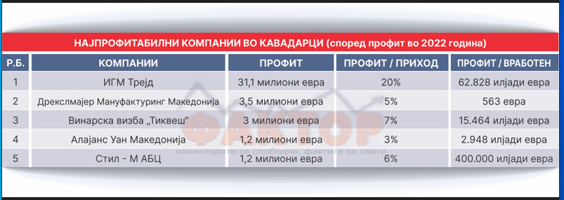 Бројките укажуваат на заклучок дека Кавадарци е економски е најуспешниот град во Македонија од аспект на силни домашно поседувани компании. И му нема рамен. Веројатно е до поднебјето, генот, виното и серенадата. Секако и маџунот како двигател. Зошто? Па затоа што само во Кавадарци домашно поседуваните големи компании не само што се рамо до рамо со странските аквизиции и гринфилд инвестиции, туку се и посилни од нив!