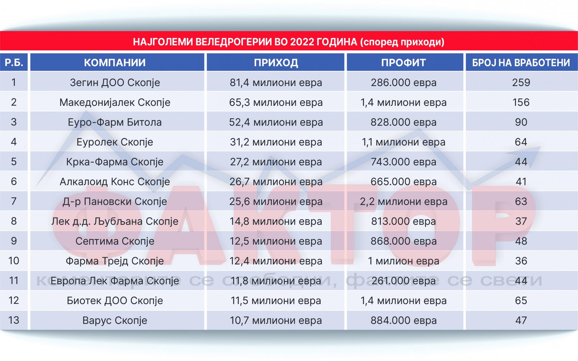 Анализата на „Фактор.мк“ покажува дека меѓу активните регистрирани веледрогерии лани има 13 компании кои успеале да направат приход поголем од 10 милиони евра. Нивниот агрегатен приход од продажба на регистрирани лекови, препарати и медикаменти надминува 380 милиони евра во 2022 година.