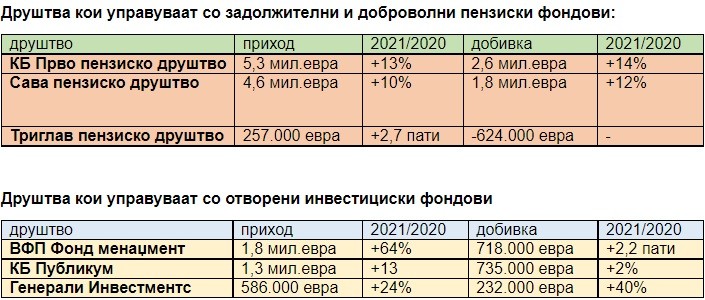 Од шест друштва кои управуваат инвестициски фондови (задолжителни и доброволни пензиски и отворени инвестициски фондови) дури пет завршиле со добивка во работењето за 2021 година. При тоа најниската добивка изнесува 39% од приходите, а најпрофитабилното друштво има добивка што е 56% од остварените приходи