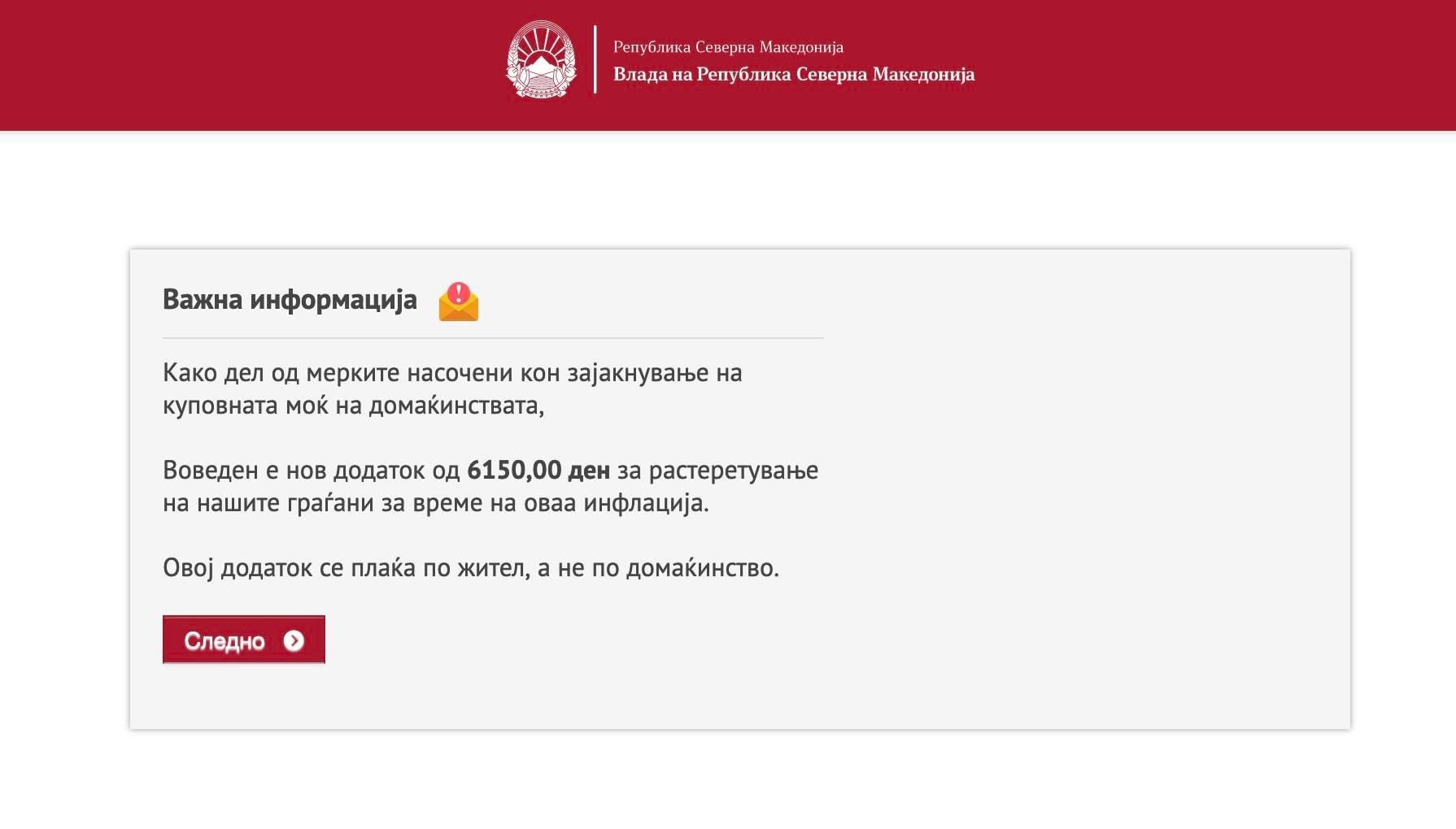 Нов линк се шири по социјални медиуми кон сајтот vlada-mk . com преку кој креаторите се обидуваат да дојдат до податоците за вашата платежна картичка. Приказната е дека Владата давала 100 евра по жител за да се „растерети“ инфлацијата.
