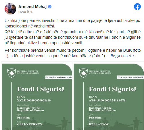 „Нашата армија континуирано се консолидира преку инвестиции во оружје и друга воена опрема. За да бидеме уште посилни за да гарантираме побезбедно Косово, сите вие драги граѓани можете да придонесете со донирање во Фондот за безбедност на активна сметка внатре или надвор од државата. Косовските безбедносни сили, наша гордост“, напиша тој.