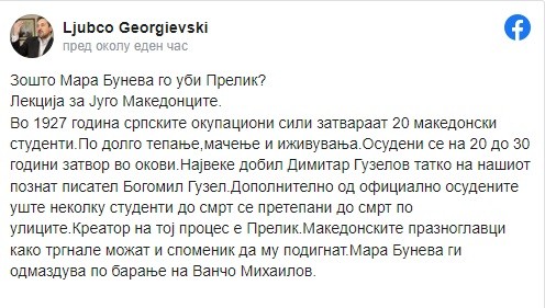 „Зошто Мара Бунева го уби Прелик? Лекција за Југо Македонците. Во 1927 година српските окупациони сили затвараат 20 македонски студенти. По долго тепање, мачење и иживувања. Осудени се на 20 до 30 години затвор во окови. Највеке добил Димитар Гузелов татко на нашиот познат писател Богомил Гузел. Дополнително од официјално осудените уште неколку студенти до смрт се претепани до смрт по улиците. Креатор на тој процес е Прелик. Македонските празноглавци како тргнале можат и споменик да му подигнат. Мара Бунева ги одмаздува по барање на Ванчо Михаилов“, стои во објавата.