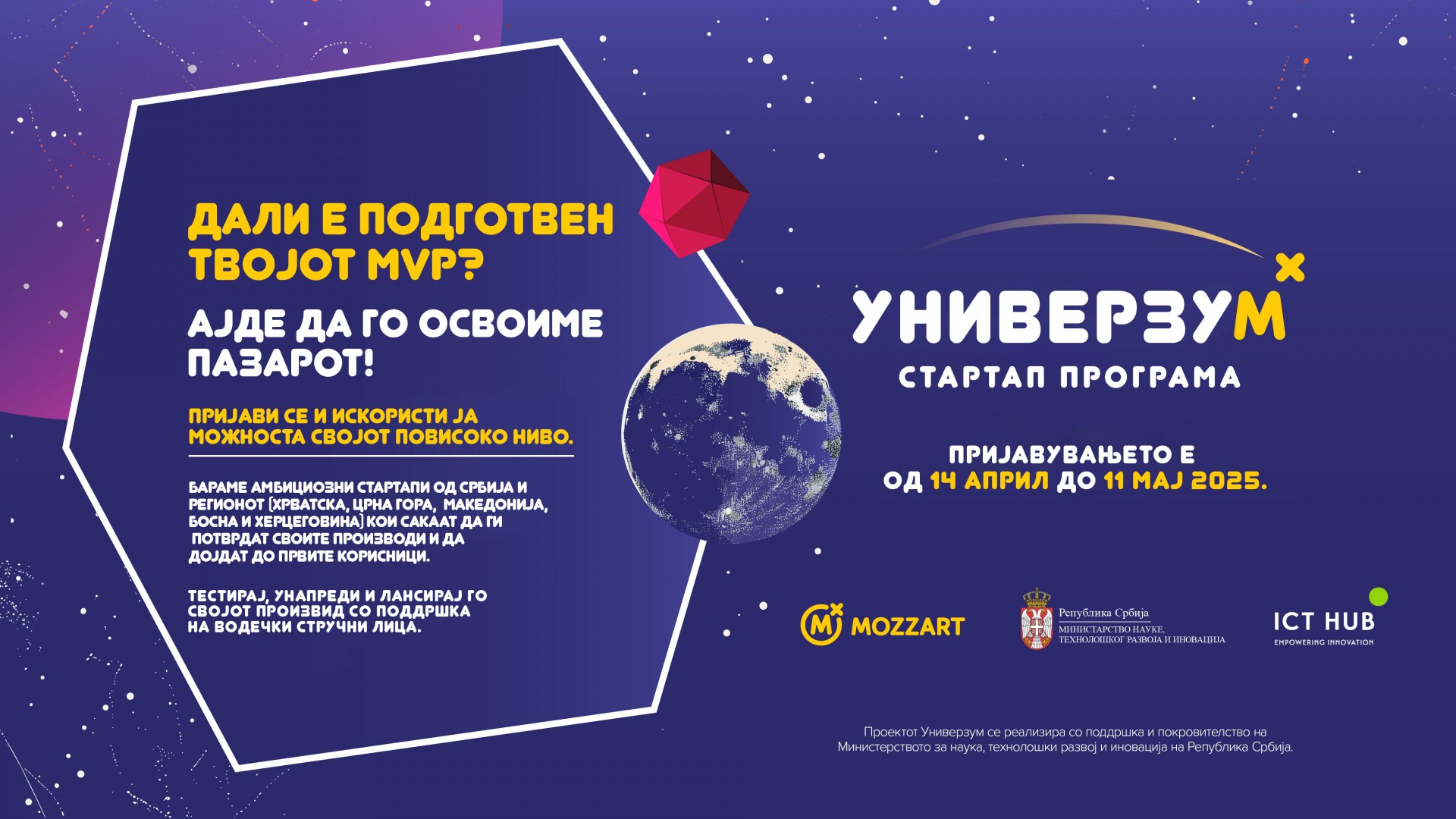 Универзумот продолжува да се шири!Компанијата Mozzart – Србија официјално го започна четвртиот последователен циклус на програмата за поддршка на стартап заедницата – Универзум, а пријавувањето е отворено до 11 мајна следниот линк.