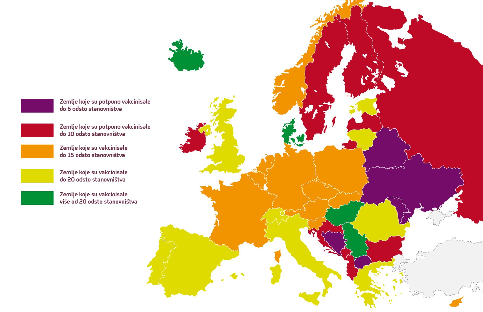 Во текот на минатата недела, во просек дневно се давале по 94 393 дози, а покрај „спутник“ се нудат и „Синофарм“, „Астра Зенека“, „Модерна“, „Фајзер“, но и малку познатата вакцина од кинескиот производител „CanSino Biologics“. Србија е во иста група со Унгарија, и е обоена на мапата со зелена боја, што значи дека се имунизирани над 20 отсто од жителите.