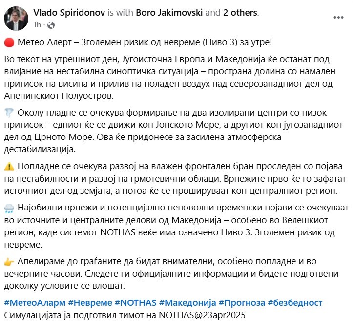 Апелираме до граѓаните да бидат внимателни, особено попладне и во вечерните часови. Следете ги официјалните информации и бидете подготвени доколку условите се влошат“, напиша тој на социјалните мрежи.