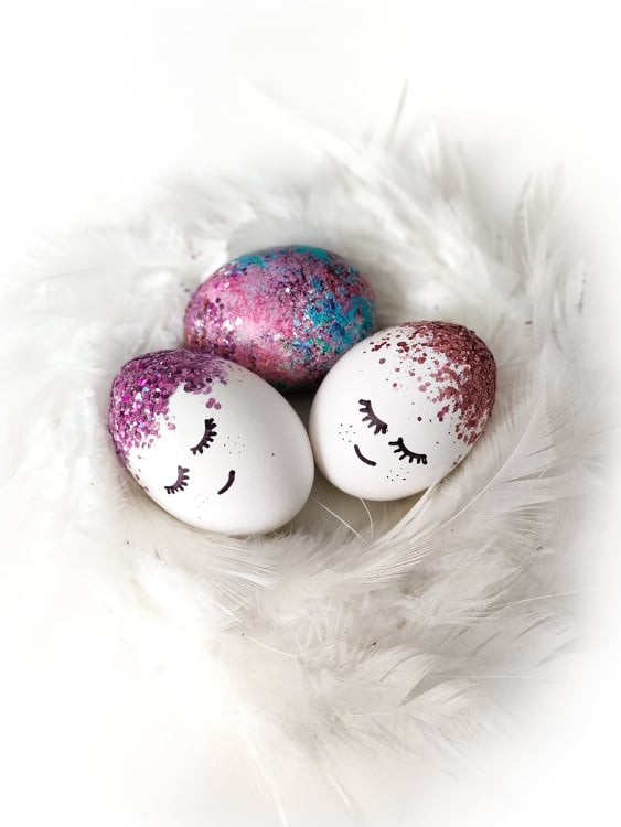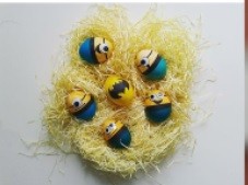 „Околу изработката, за minions јајцата, се става јајцето половина во жолта боја, односно врвот, а откако ќе се потсуши другата половина во сина боја. Не мора совршено да се спојуваат затоа што се лепи лента самолеплива хартија која што претставува ремен. На жолтиот дел се лепи обрач потенка самолеплива лента и на средината се лепат две очиња. Очињата се купуваат, има пакување со различни големини, не се самолепливи, и за истите ќе ви биде потребно течно лепило. На крај цртате веѓи и уста со црн водоотпорен маркер. Бело јајце, или бојадисано, ама бледо, пастелно, кратко оставено во бојата, на врвот се става течно лепило, се наросуваат со светкав прав, може прехрамбен, јас преферирам светки за декорација на нокти, можете да ги најдете во парфимерија, затоа што се покрупни и позабележливи. Потоа се цртаат очиња и уста со маркер“, додава Милевска.