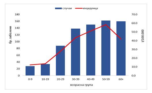 Најголем број на заболени се на возраст од 50-59 години – 162 (21,3%), каде е регистрирана и највисока специфична инциденца – 58,3/100.000, стои на веб страницата на Институтот за јавно здравје.