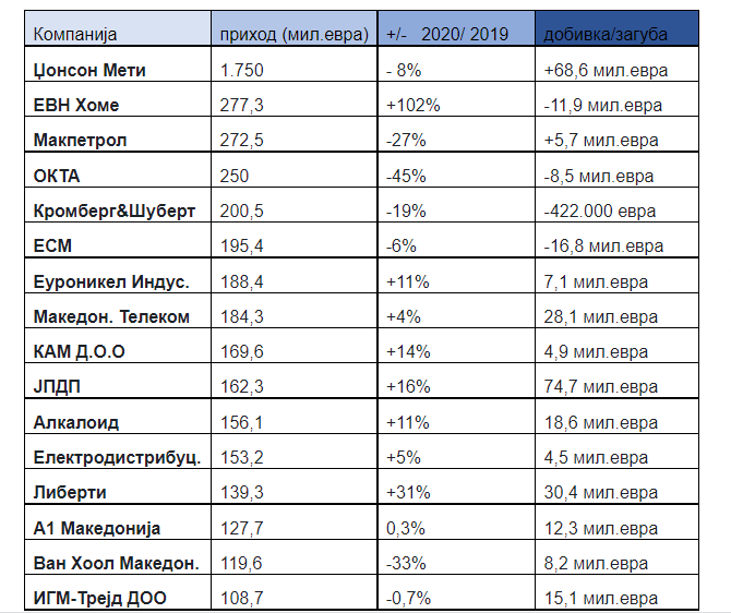 Во нашата национална економија лани 16 компании направиле приходи повисоки од 100 милиони евра. Меѓу нив седум друштва се изразити извозници, а другите се генерално или целосно ориентирани на домашниот пазар. На листата на најголемите 16 има три од бројните странски гринфилд инвестиции. Кај сите три е евидентно намалување на приходите што е резултат на намалените нарачки предизвикани од корона кризата. На листата има две државни фирми и четири кои се мнозински поседувани од домашни акционери. Убедливо најголема компанија која е стационирана во земјава, а работи за извоз е производителот на автомобилски катализатори (меѓу другото) „Џонсон Мети“ која лани имала приход од 1,75 милијарди евра. Најмалиот на листата на најголемите е кавадаречкиот металски гигант ИГМ-Трејд кој лани имал приход од 108,7 милиони евра.