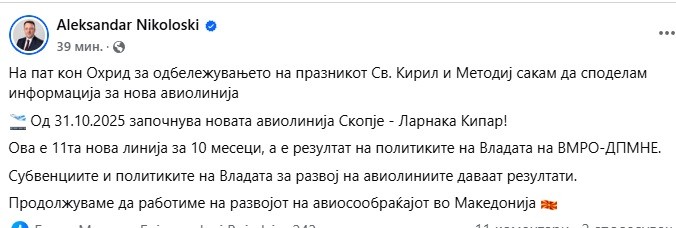 „Субвенциите и политиките на Владата за развој на авиолиниите даваат резултати“, пишува министерот Николоски на Фејсбук.