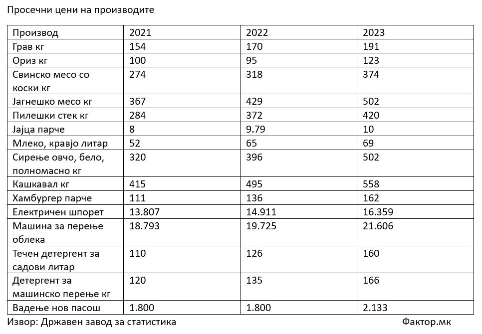 Нема производ или услуга која во изминативе две години не добила повисока цена. Од хранливите производи како јајцата, млекото, брашното, месото, месните производи, но и многу услуги од 2021 година наваму постојано поскапуваат. Ова го покажува годишникот на Државниот завод за статистика, каде што има огромна листа на производи кои се користат во секојдневието и кои поскапувале секоја година.