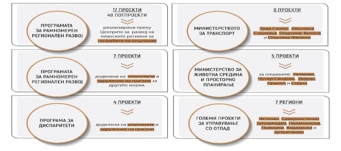 - Проектот за регионално управување со отпад, кој опфаќа пет плански региони и 45 општини, е проценет на 95,7 милиони евра. Иако во рамки на ИПА I (2007–2013) беа изработени физибилити студии во вредност од 3,6 милиони евра, нивните резултати не беа применети при дизајнирање на проектот поради промена на технички решенија со спојување на два плански региони - се наведува во извештајот.