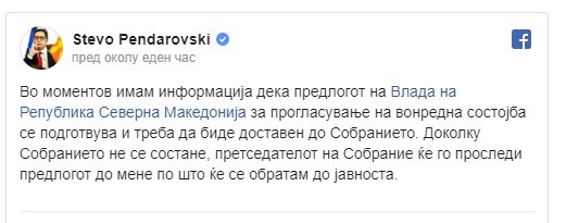 Шефот на државата, Стево Пендаровски на неговиот официјален Фејсбук профил објави дека имал информација дека предлогот на Владата за прогласување вонредна состојба се подготвува и треба да биде доставен до Собранието.