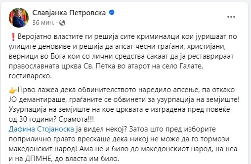 „Веројатно властите ги решија сите криминалци кои јуришаат по улиците деновиве и решија да апсат чесни граѓани, христијани, верници во Бога кои со лични средства сакаат да ја реставрираат православната црква Св. Петка во атарот на село Галате, гостиварско. Прво лажеа дека обвинителството наредило апсење, па откако ЈО демантираше, граѓаните се обвинети за узурпација на земјиште! Узурпација на земјиште на кое црквата е изградена пред повеќе од 30 години? Срамота!!! Дафина Стојаноска ја видел некој? Затоа што пред изборите поприлично грлато врескаше дека никој не може да го тормози македонскит народ! Ама не и било до македонскиот народ, на неа и на ДПМНЕ, до власта им било“, пишува Петровска.