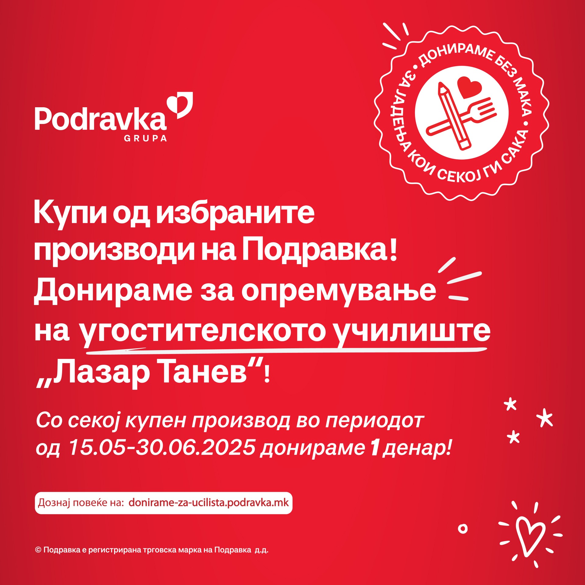 Овој општествено одговорен проект трае од 15.5. до 30.6.2025 година, а за време на тој период, 1 денар од продажбата на селектирани производи на Подравка ќе биде наменета за поддршка на угостителското училиште ,,Лазар Танев”,. Собраните средства ќе се искористат за набавка и обнова на опрема во кабинетите за практична настава, со што ќе се унапреди образовниот процес за идните готвачи и угостителски стручњаци.