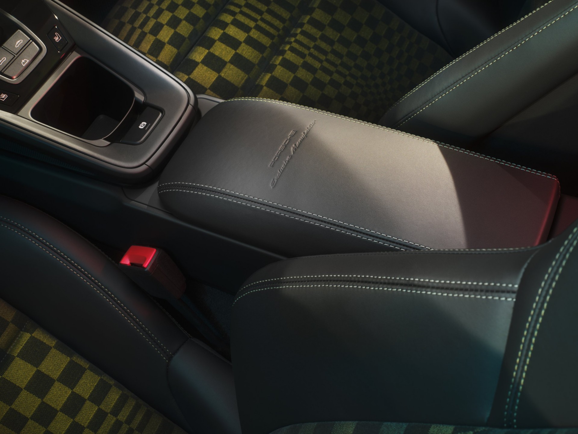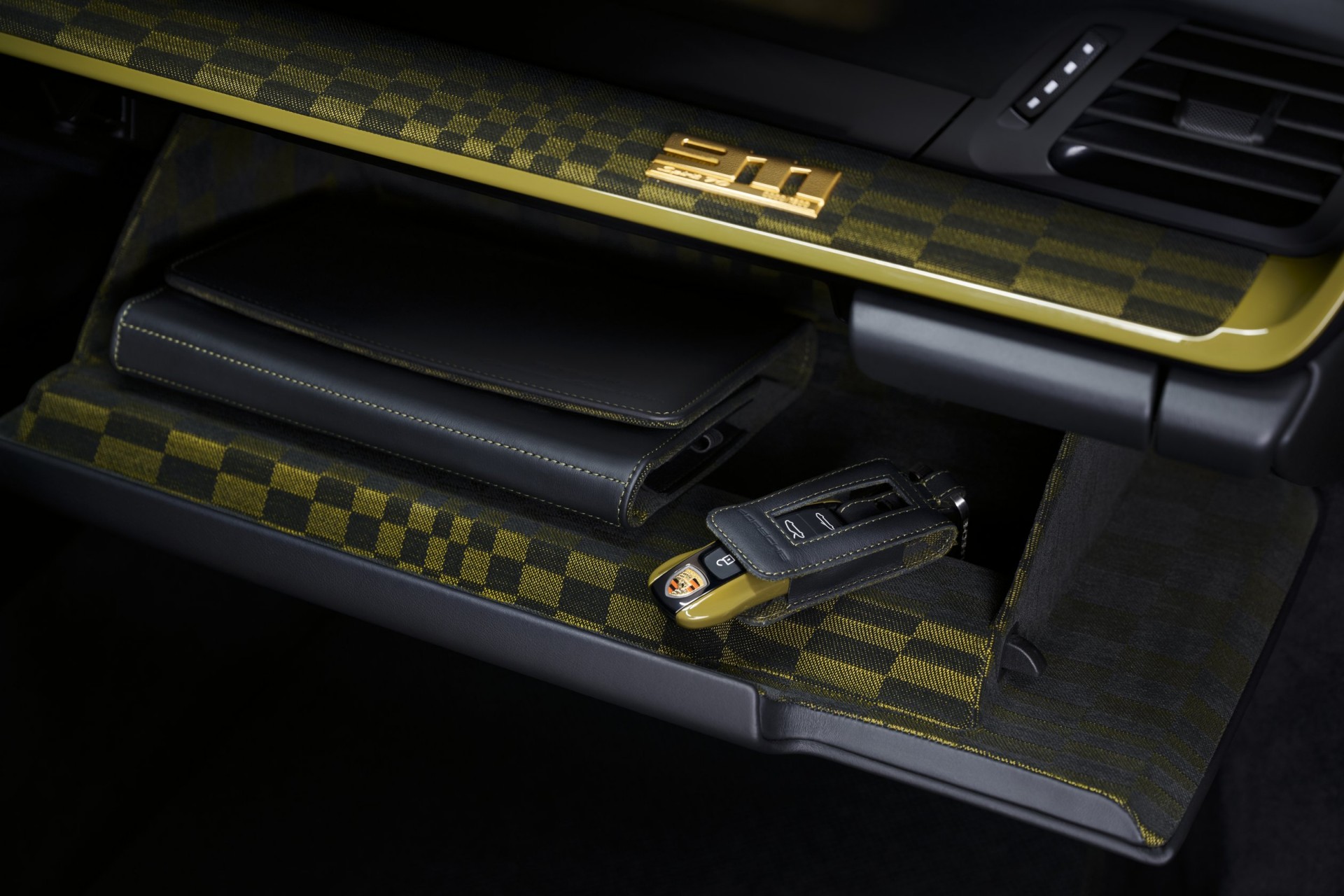 Врвот на ентериерот е иконскиот Pasha дизајн на ткаенина во црно/маслиново нео. Графичкиот дизајн на материјалот потсетува на карирано знаме кое се движи. Различни големини, паметно наредени правоаголници создаваат еден вид движење во шемата. Наместо jacquardvelourкако во минатото, 911 Spirit 70 комбинира текстил и тн. flockyarns. Ова му дава на материјалот уште поспортски карактер, подобрено чувство и повеќе удобност, особено на подолги патувања.