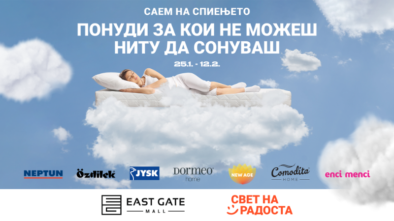 Добриот сон е важен за здравјето на луѓето, а тоа зависи од удобноста на креветот, цврстината на душеците, ергономијата на перниците. Од таа причина Ист Гејт Мол заедно со своите првокласни брендови и реномирани брендови од сегментот за уредување на домот, JYSK Neptun, Comodita Home, Ozdilek, Dormeo Home, New Age, Enci Menci го организира првиот саем на спиењето со широка понуда од удобни душеци до мека постелнина, детски кревети, додатоци за спални соби, прочистувачи на воздух и озонери - односно сѐ што е потребно за совршен сон.