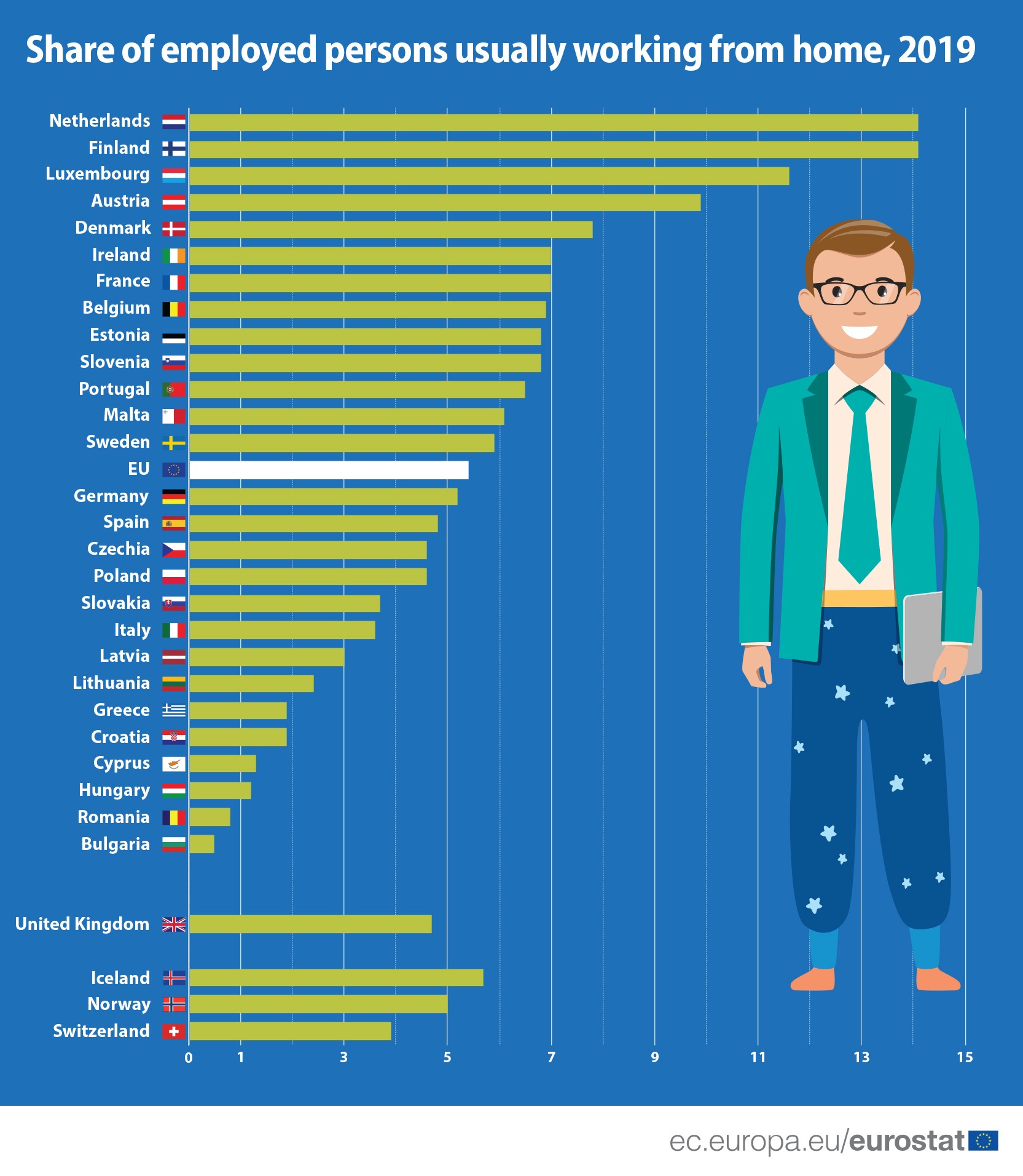Холандија и Финска се најдоа на врвот на листата на земји членки на ЕУ кои се лидери со работа од дома, со 14,1 отсто од вработените лица кои работеле од дома во 2019 година.