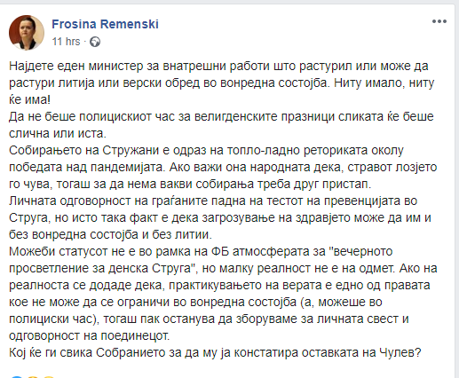 Најдете еден министер за внатрешни работи што растурил или може да растури литија или верски обред во вонредна состојба. Ниту имало, ниту ќе има, напиша на својот фејсбук профил Фросина Ременски од СДСМ поптпретседател на Собранието, поранешна министерка. СДСМ побара оставка од министерот Наќе Чулев за настанот во Струга. Ременски проблематизира и за тоа кој ќе констатира оставката на Чулев.